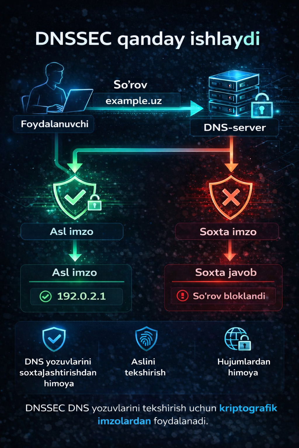 DNS server javobni kriptografik imzo bilan birga yuboradi.